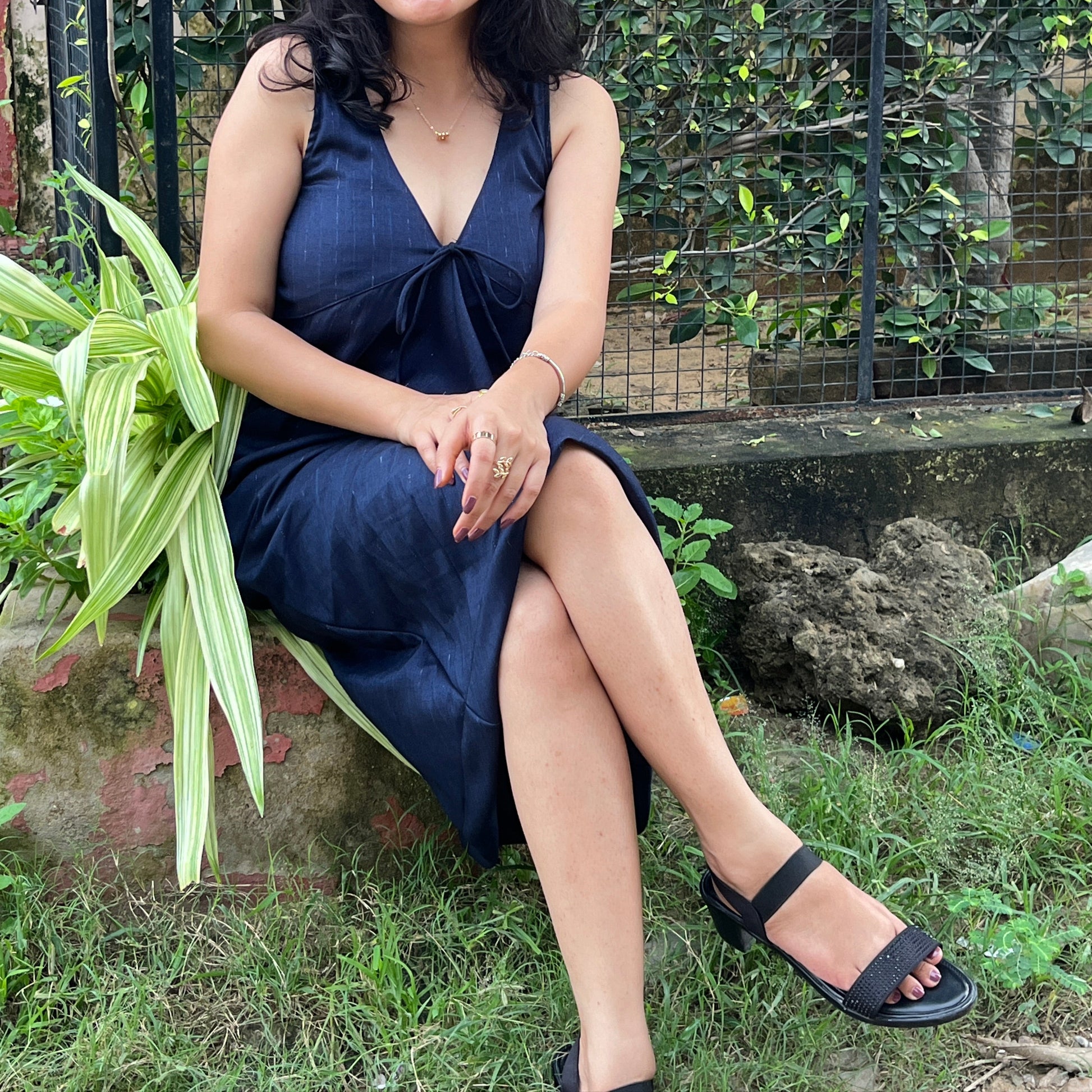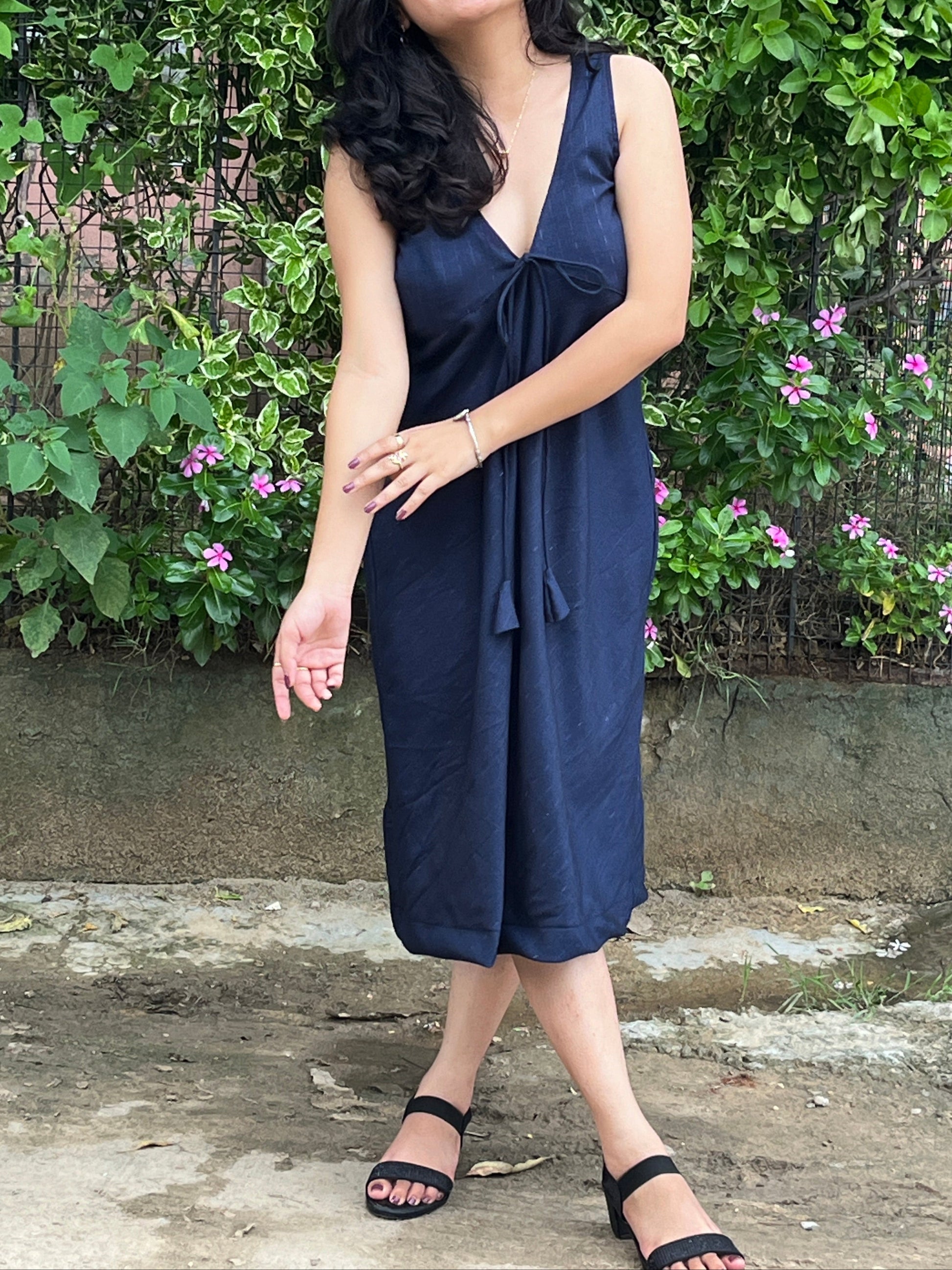 Crafted from a shimmering navy blue Lurex fabric, this dress flows with light and form, making every step feel like poetry in motion.