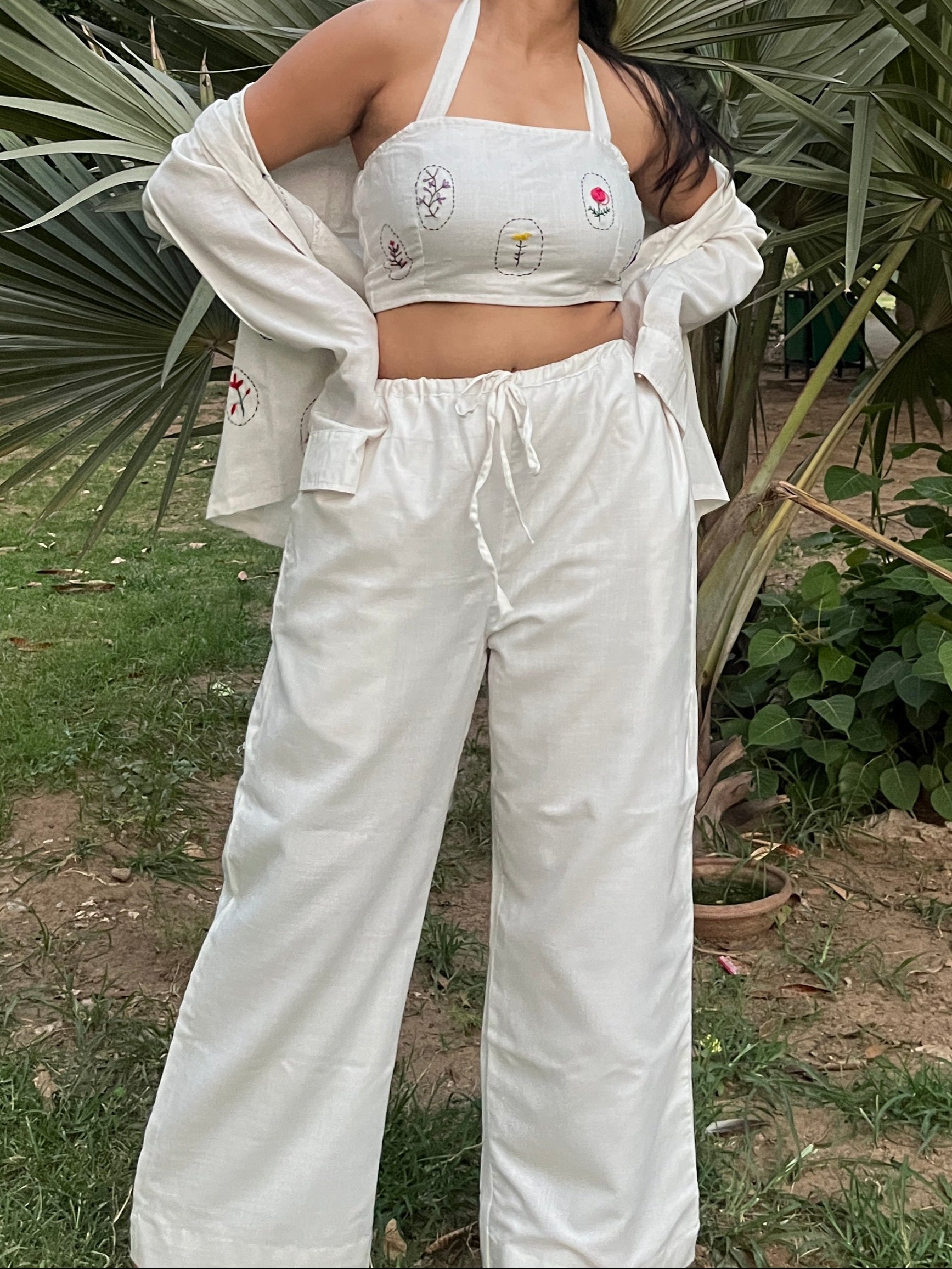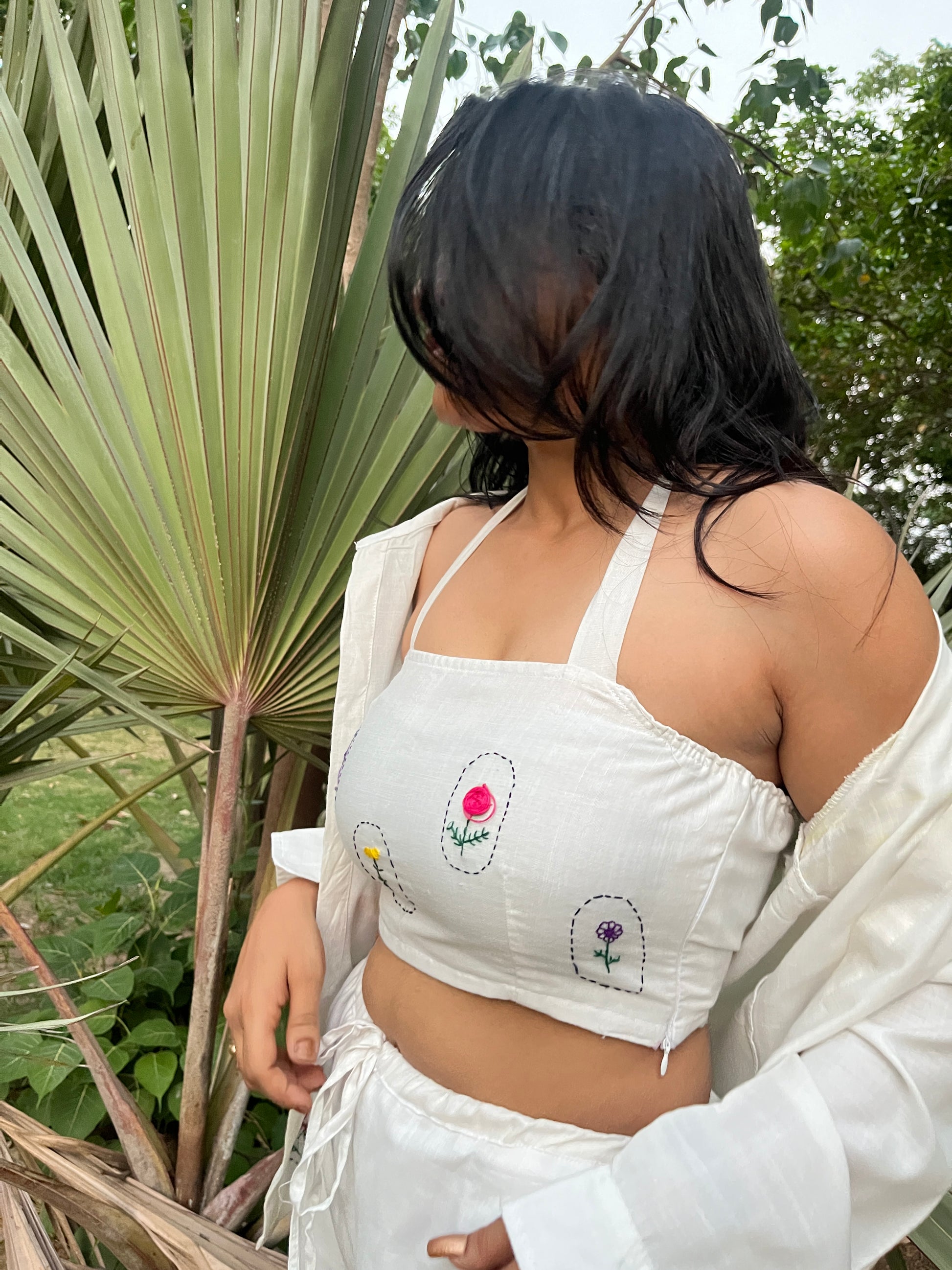 "Each Nooré crop top represents a collaboration between contemporary design and traditional embroidery techniques. Our skilled artisans carefully place each stitch, creating these botanical circles that celebrate nature's beauty in wearable form."