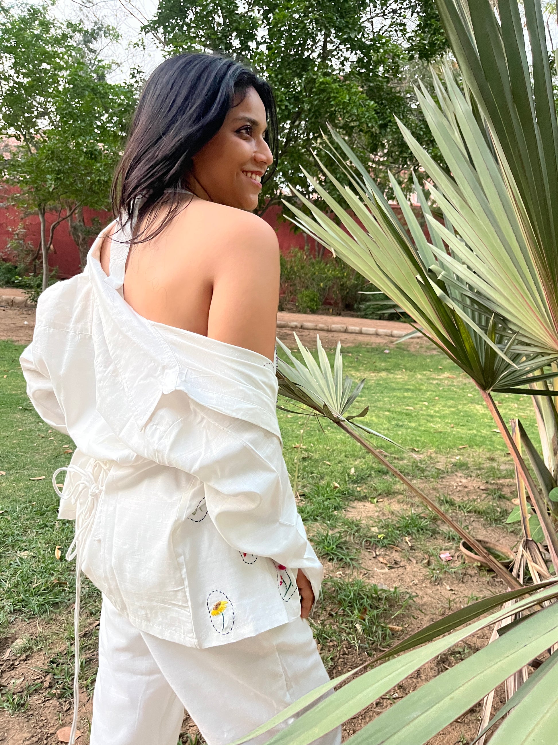 "Meet the star of summer - our Nooré crop top where miniature gardens bloom across pure white fabric. Each hand-embroidered circular motif captures the essence of a secret garden with delicate pink roses, sunny yellow blooms, and fresh green leaves."