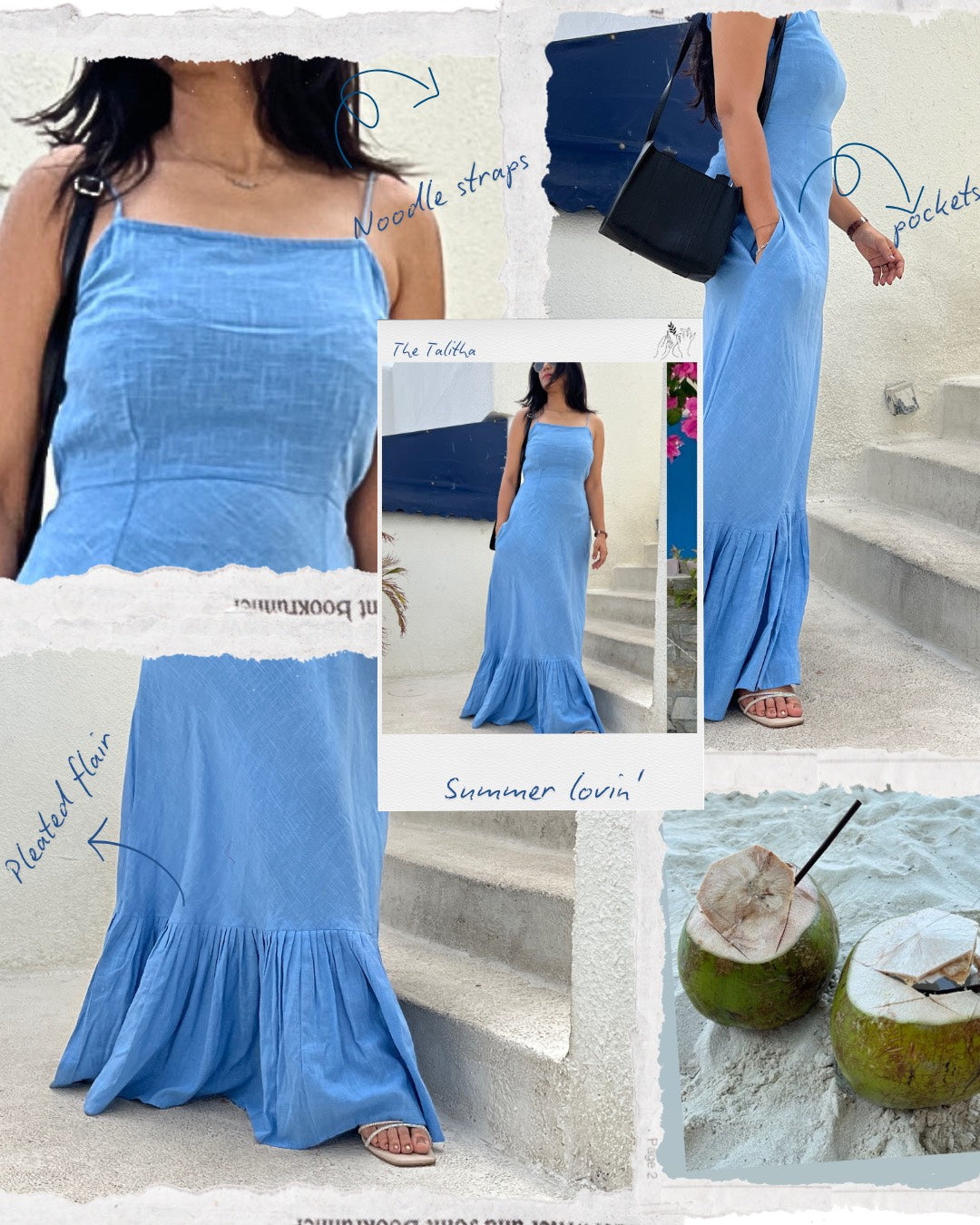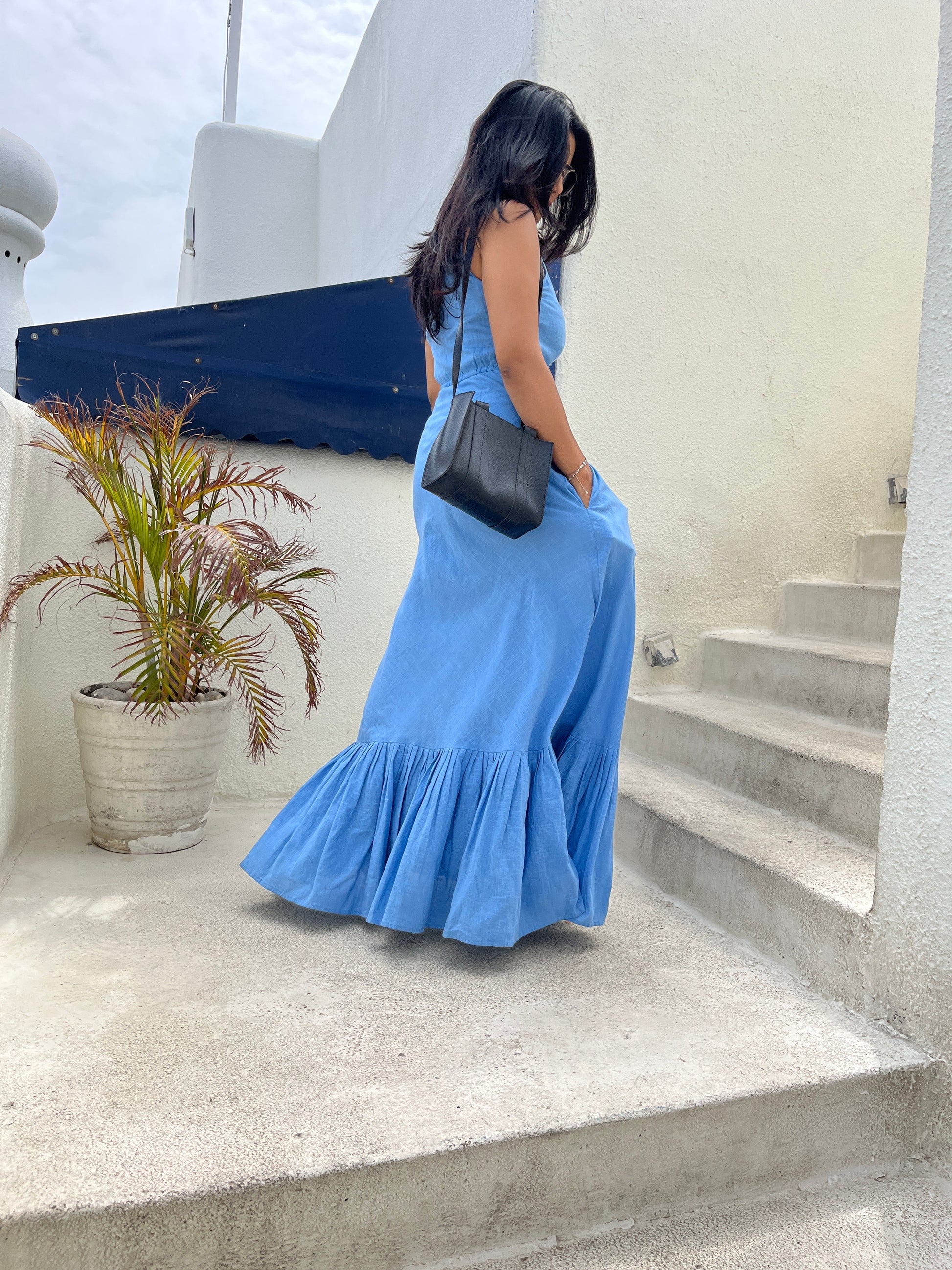 This full-length, strappy blue slub dress embodies effortless elegance and bohemian spirit, designed for the modern woman who embraces both comfort and captivating allure.